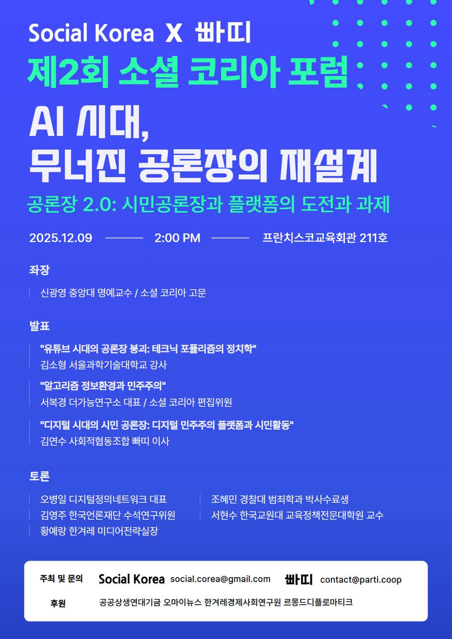 열린공론장을 지향하는 <소셜 코리아>가 제2회 소셜 코리아 포럼을 개최합니다. 'AI 시대 무너진 공론장의 재설계'를 주제로 '빠띠'와 함께 여는 포럼에 많은 관심 바랍니다.
